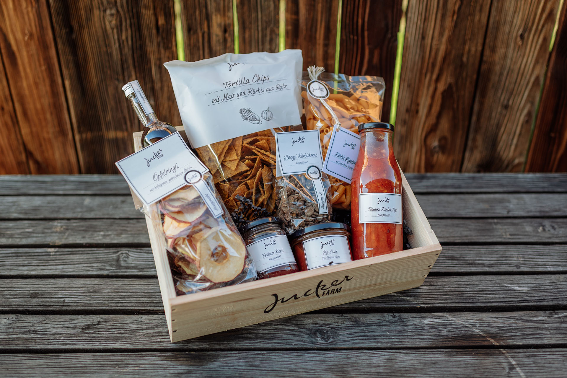 Diese hochwertige Holzkiste eignet sich perfekt als regionales Geschenk für deine Liebsten. Die Kiste kann in einem unserer vier Hofläden abgeholt werden.