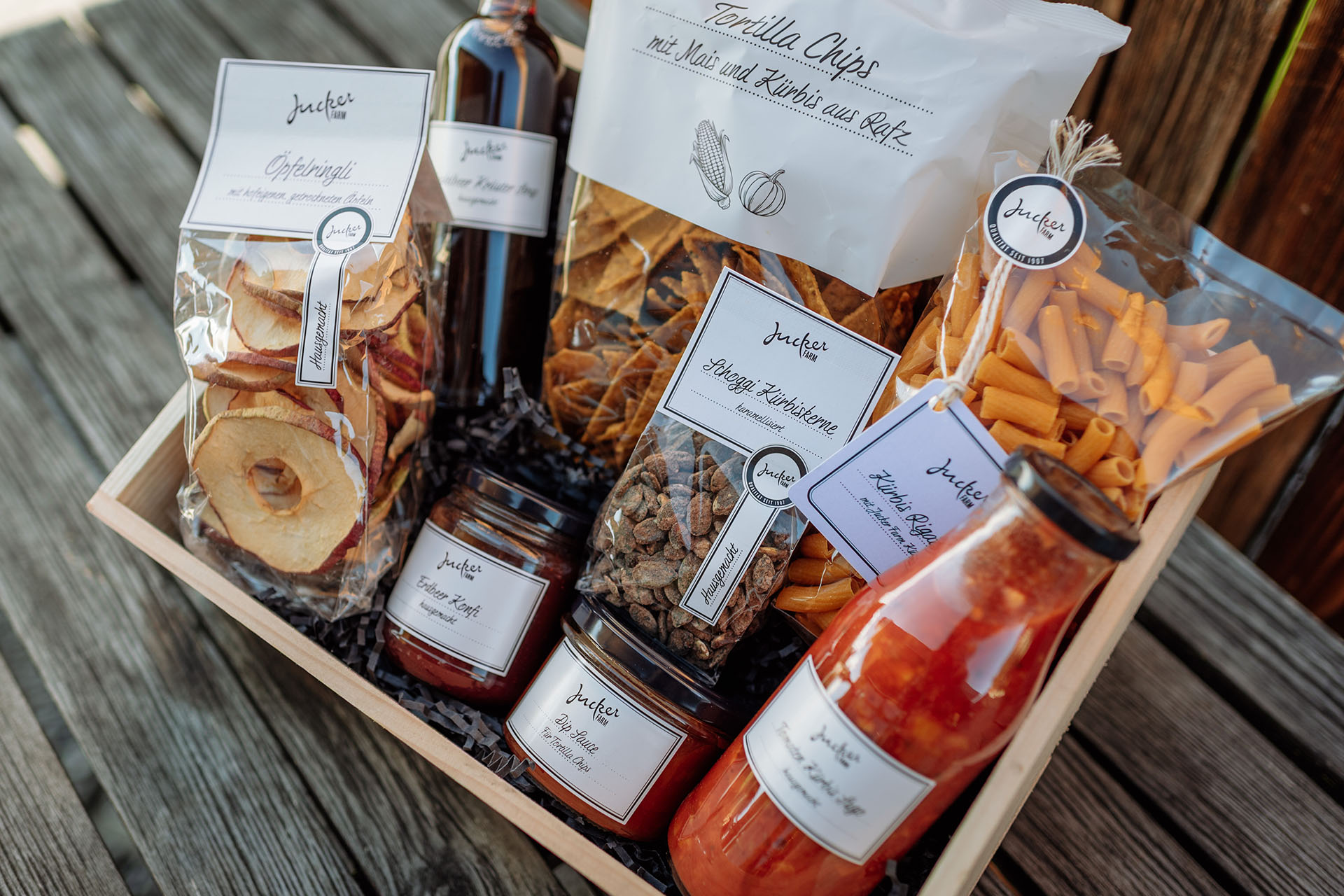 Ob für Geburtstage, Jubiläen oder Hochzeiten - die kleine Geschenkkiste aus Holz mit acht hausgemachten Hofladenprodukten aus regionalem und nachhaltigem Anbau. Ein liebevoll zusammengestelltes Geschenkset, das Genuss und Verantwortung vereint. Folgende Produkte sind in der Geschenkkiste vorhanden - die jeweiligen Zutaten und Nährwerte findest du im Einzelprodukt: