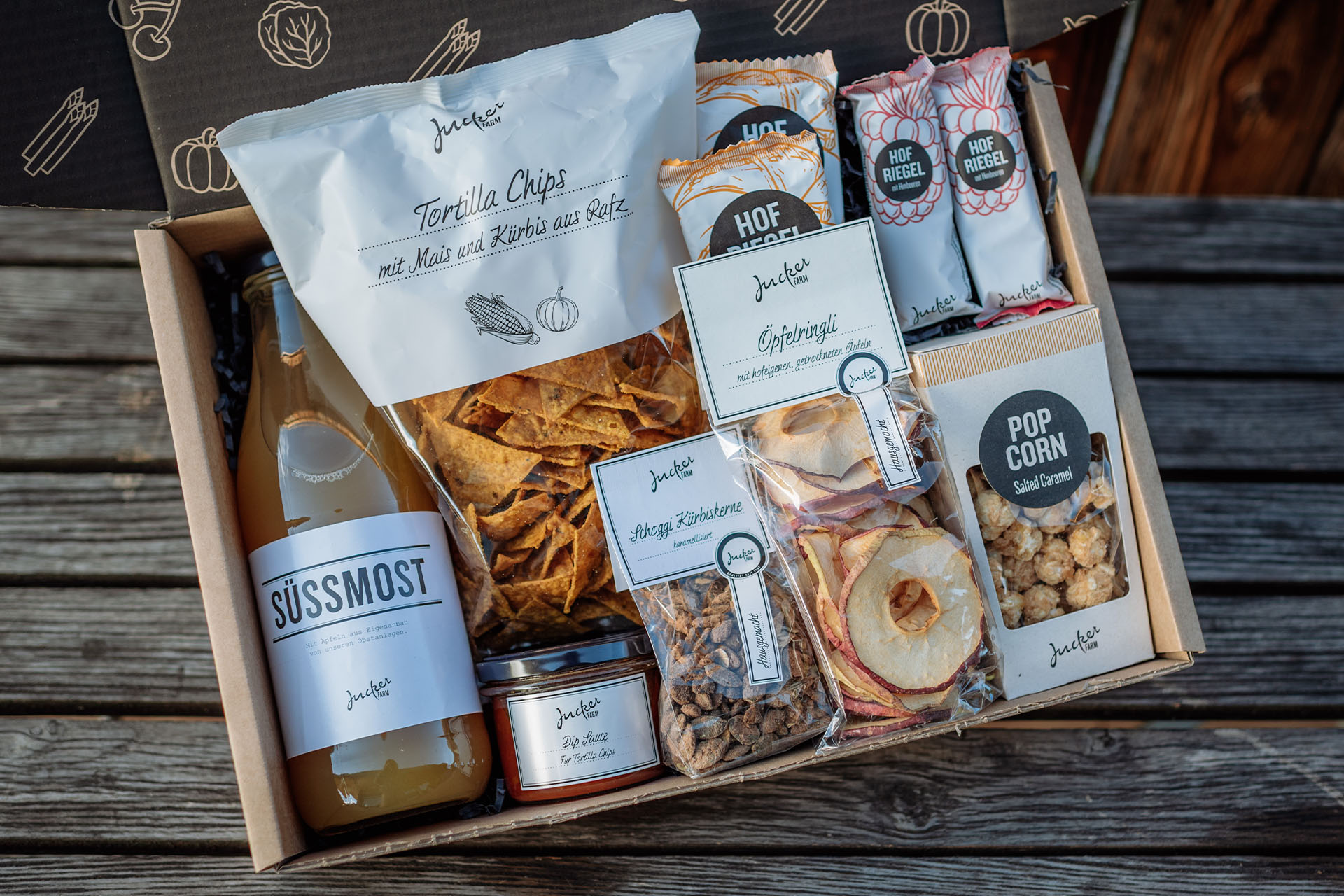 Der Znüni Korb fürs Büro - mit Hofriegeln und getrockneten Apfelringen, Popcorn Salted Caramel sowie einer Tüte knackiger Tortilla Chips mit Kürbis und der passenden Dipsauce dazu. Wenn der kleine Hunger vor dem Mittag anschleicht, ist diese Snackbox genau die richtige Überbrückung. Für den Durst ist auch eine Flasche Süssmost mit Jucker Äpfeln dabei.