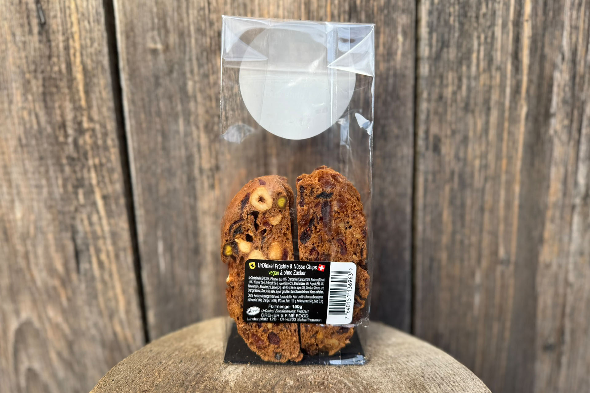 Knusprig, fruchtig, unwiderstehlich: Die Früchte & Nüsse Chips von DREHER’S FINE FOOD sind kleine Geschmacksexplosionen. Jedes Stück vereint saftige Pflaumen, süsse Cranberries und Rosinen mit knackigen Hasel- und Baumnüssen sowie einem Hauch Pistazien. Ein Schuss Rotwein und fein abgestimmte Gewürze wie Zimt, Anis, Nelke und Ingwer verleihen den Chips eine warme, aromatische Tiefe.